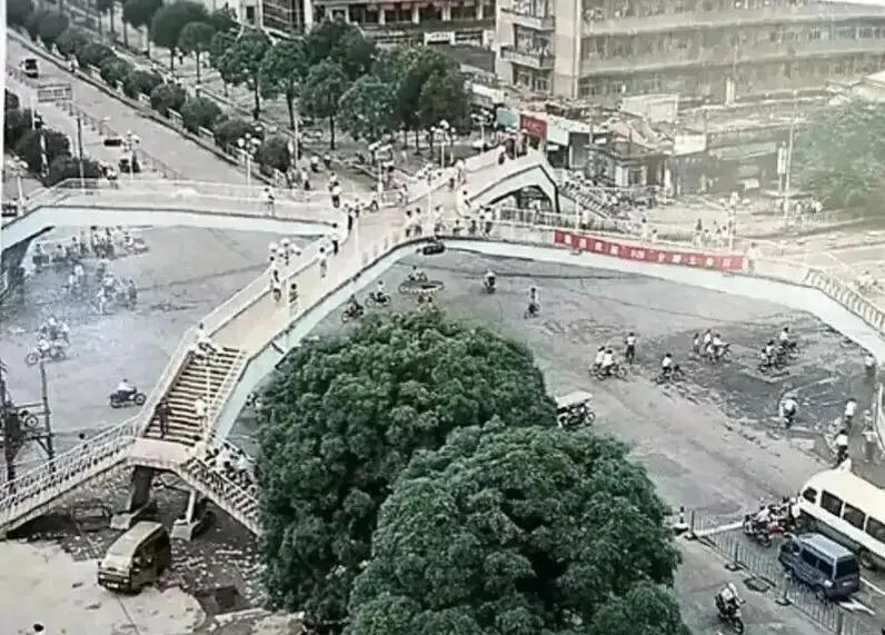 这张里头是滨江立交桥,桥上那密密麻麻的人头,远远望去像河水流动,八十年代末谁家去趟市区,准得过一次这个桥,当时可没有小车代步,都是骑单车走路的,夏天顶着太阳,桥面烫得能煎蛋,姑妈说那时候不管下班还是放学,最堵的就是这里,旁边楼上拉横幅写着标语,今天的广告牌替代了它,靠手写板刷的年代,感觉格外用心。