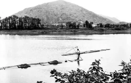 图里河面压着一排竹筏,工人站在筏头用长篙划水,河岸两边树密一片,后头是没怎么动过的山头。以前整天看大人们往水里扔柴,顺流而下送到下游,渴了直接捧河水喝,不怕脏。如今护城河两岸都被修整了,竹筏漂流成了风景区,小时候沾过的水、踩过的泥,这会儿再难摸到了。