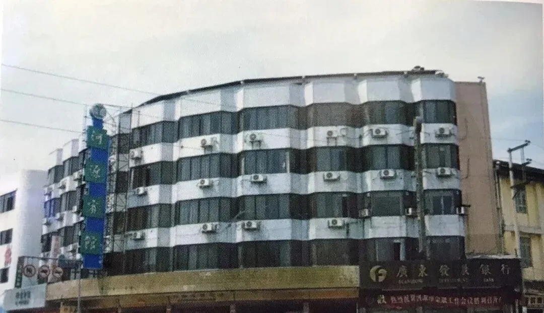 图中老酒店大楼,波浪形的窗户一扇连一扇,外墙银灰色,一看就是九十年代美学,广告牌是深蓝底白字,一楼招牌小小的,那时住酒店可算稀罕事,有些人结婚摆酒就选在这,孩子们喜欢凑热闹,偷偷踩进去吹空调,现在变成商品楼,门前的排队盛景也不见了。