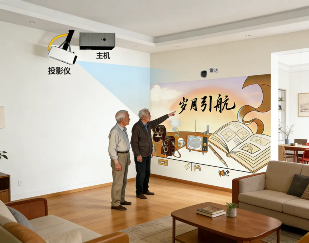 老人走近墙面,看到的是自己年轻时的结婚照、孩子的满月照、当年工作单位的照片。点击照片,系统会自然地问: