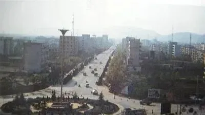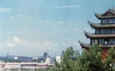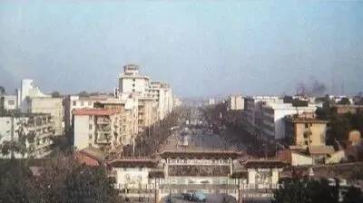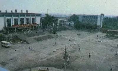 这一幕是在老人民广场那块儿,远处牌楼下面,街道笔直,两边全是低矮的商铺,早晨七八点钟就有早点摊冒热气,下午傍晚老人们坐在门口纳鞋底聊天,那年头城市节奏慢,一条街走下来能碰上一圈熟人,刚入夜时街灯一排排亮起,孩子们打闹得不舍得回家。
