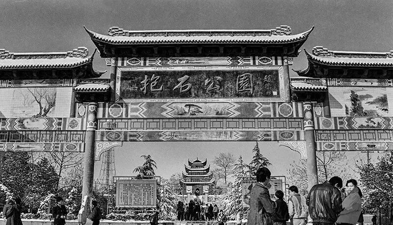 门口这牌楼写着“抱石公园”,雕花横梁一看就有年代感,老爸说小时候带我雪天来看这个门楼,公园里最热闹的就是庙会,里面卖画糖人、转木偶,左一圈右一圈的孩子们全挤在门口不肯进,有一年照了张全家福,现在那团热闹早散了,老公园门楼下留着一摞摞大家的影子。