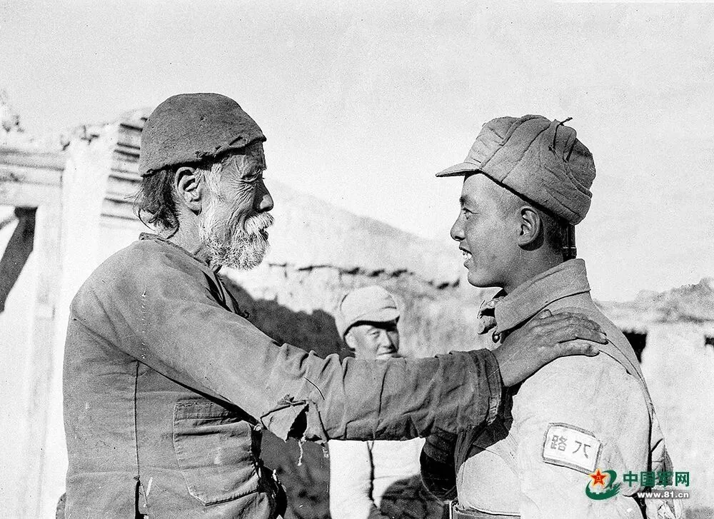 老百姓知道苦难的根源,也知道靠谁才能走出苦难、赢得新生。在我军进行绥远战役的战斗间隙,这位饱经沧桑的老大爷便找到一名战士,倾诉他遭遇的种种苦难。说话间,老人情难自抑,将右手重重搭在了战士的肩上。随军记者定格了这一幕,也记录下那泣血般的嘱托:“同志,我们的冤仇,你们一定得替我们报啊!”