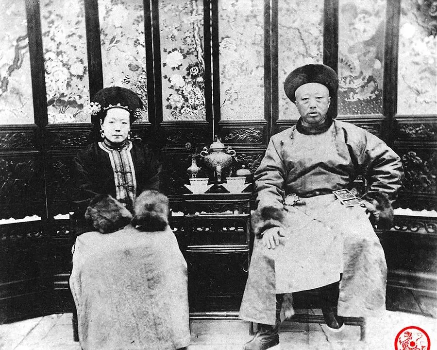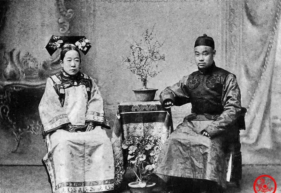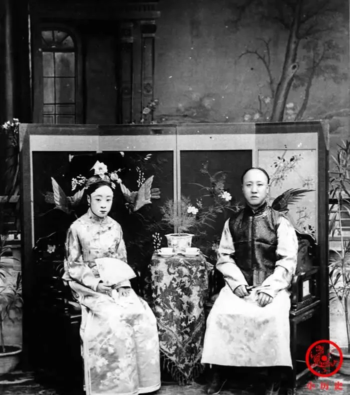 图中这一对并排坐,女的是蒙古嫁过来的格格,那头饰铺得满当当,两边像扇子一样展开,男人端坐,腰板溜直,衣服上的团龙纹一看就不是寻常料子。这张桌上的盆景有点意思,估计是专门摆来给照片添点漂亮劲。小时候家里说,皇家姑娘嫁人都讲门第,格格要是出嫁蒙古,家里都得大操大办,那氛围比自家巷子热闹多了。
