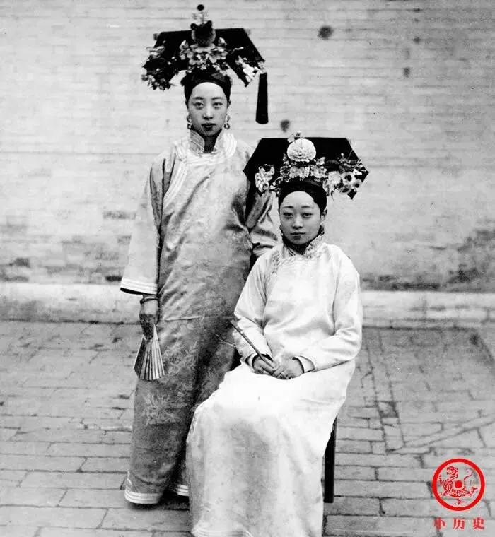 这张两个格格,一个站一个坐,头上那两把“翅膀”似的大头饰夺人眼球,身上衣袍利落。这种标准造型,旧戏台上也能看见,可真让人穿一天,全身都得压出印儿来。听长辈说,嫁出去的格格比自家姑娘受管束多,衣食住行都有专人盯着,“规矩多,日子紧”,看照总觉得她们眼神后面有点别的心事。