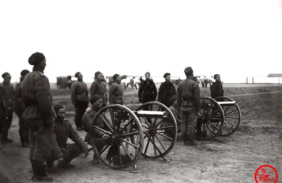 图里这些人穿着厚厚的棉军装,地上停着两门轮子高高的大铁炮,这东西叫马克沁快炮,旁边士兵站有站有蹲,个个眼神里透着股新鲜劲头,场面有点紧张也有点稚气,这一圈人抬头看着军官,没人敢懈怠,听说那时候训练不是闹着玩,打靶打得好还得打报告,不合格分分钟挨骂,到了今天看,战争味道老早散了,地上那轮子印都快磨没了,可一圈围着炮蹲下的样子还真带劲。