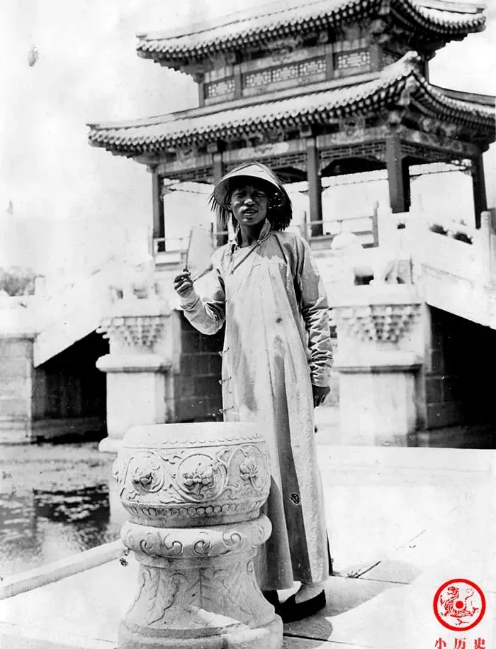 石栏后面,颐和园的桥和楼映在后头,这个身子瘦小的孩子穿一身大褂,竹帽遮着脸,笑起来全是顽皮劲儿,说是小太监,有时候干的活不重,就是规矩多,活动范围小,奶奶老说小孩子天性里爱玩闹,太监再苦也会趁没人时耍下滑头,这照片正好逮着这股劲,站那儿人模狗样的,谁也拦不住他偷着乐。