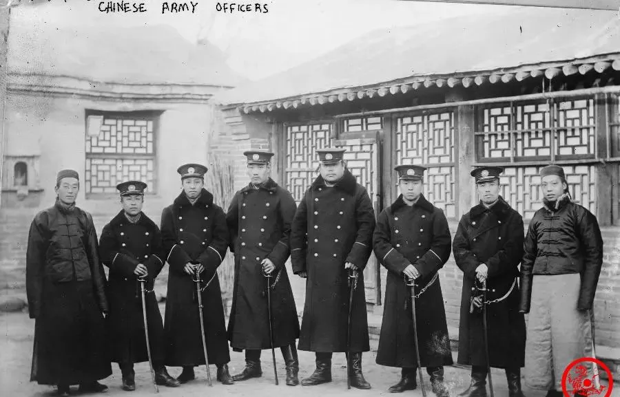 这个阵仗不大,人少气场足,长呢大衣一水墨黑,军帽扣得正,腰里别着刀,不张嘴都感觉一句话能定个小场面,屋后头那铁栅栏窗是传统味,一看就是改良和本土杂糅的产物,这会子大家伙没说话,看镜头带点严肃,说不定心里正忐忑“这照片能不能传到京里去”,现在回头看,这帮新派军官的排场和精气神,和老照片里那帮臃肿的八旗兵完全不是一挂,真有点“天要变”的意思,老头家每每见到军人,都说是那几年新政种下的苗头。