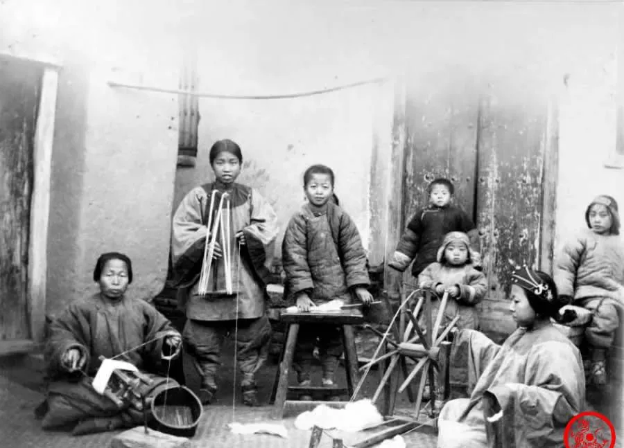 这幅画面不是摆拍,家里一屋女人孩子,手上全没闲着,左头角坐着的阿婆拧线,边上小丫头盘着原棉条,靠门口的老太太绷着脸专心拉纱,屋里的姑娘边搓边看大人手法,有个小孩屁股都蹲在板凳边上,生怕错过动作,纺线织布在那会儿可是手艺活,谁家姑娘纺得光顺细溜,婆家就觉着手巧,以前没工厂,妈妈辈讲,纺织、做针线,这种东西能练出心性,小姑娘做活的模样,比什么都顺眼,现在家用缝纫机搁在角落,纱线打结也没人去理。