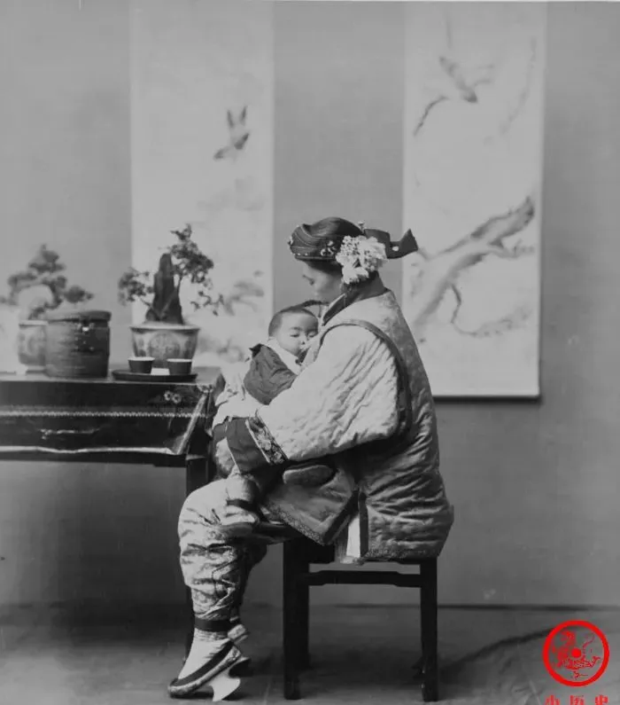 这个坐姿端正的女人,发饰一丝不乱,身子微微朝前,怀里把孩子护得死死的,不管外头多大风雨,有母亲在一头,就是心定的地方,屋角的盆景,画轴上一只鸟,案头茶盏摆得齐整,这种画面放到现在也是一张安静的全家福,没有高声语,温情全在细节里,老爷们回来一推门,见娘儿俩窝在角落,心里也塌实,小时候困了总黏着妈,屋里讲故事,外头天黑,这种情景,谁看不得心热。