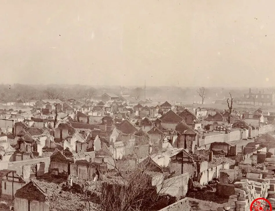 这一大片残垣断壁就是前门外烧剩下的房屋,光看见一溜溜破墙,屋顶塌成堆,街面都找不到完整的门脸,听书里讲,1900年那场火真不是小动静,义和团拿着火把一路点,洋货店子一夜全烧塌,眼见四千来家铺子全搭进去了,有的家连账本都没抢出来,爷爷说他小时候路过前门,大人还边走边说“那年闹得真厉害”。