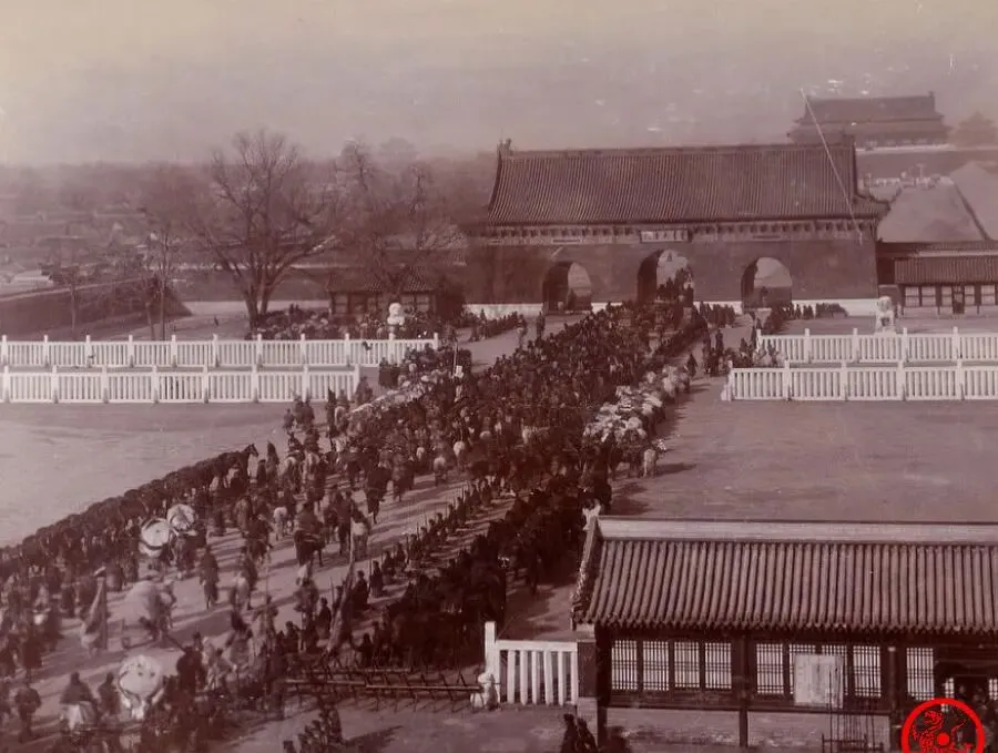 这一幅阵势可得看仔细,图中黑压压排成长龙的是慈禧太后回銮仪仗队进大清门,护道白栅栏一直延到宫门,马队轿子丝毫不乱,气氛里透着一股说不出的隆重感,周遭百姓站得远远的,谁也不敢上前一步。