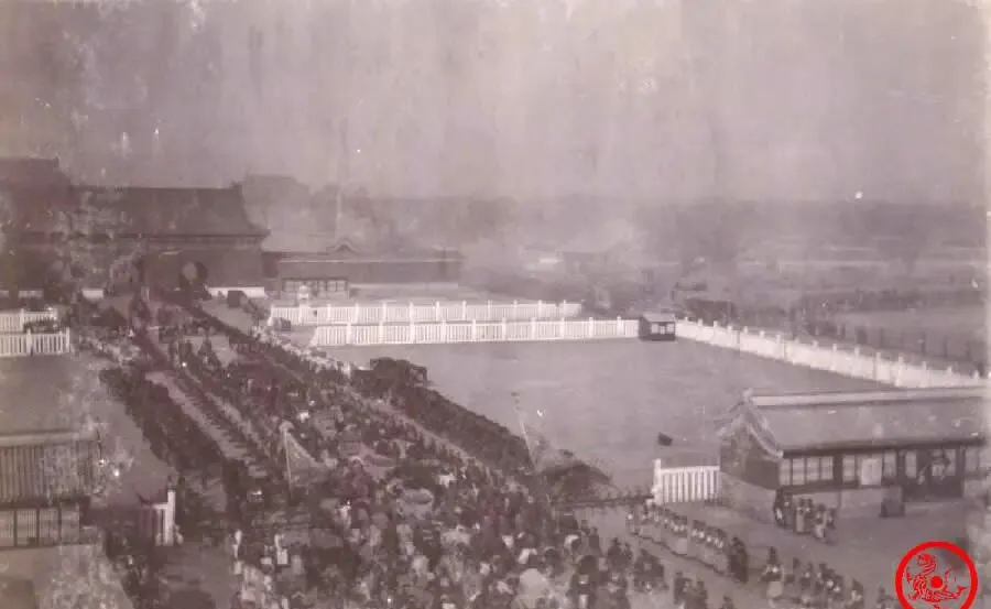 另一个角度,还是慈禧仪仗队进宫的场面,画面圈起半个广场,轿子一顶接一顶,队伍拉得长长,气派不是普通人能见着的,听外头人私底下说,慈禧这次归来,箱箱货物随队,金银细软堆成山,行李车光是预备三千辆,各路地方官都得在沿途接驾伺候,敲锣打鼓生怕少了气氛。