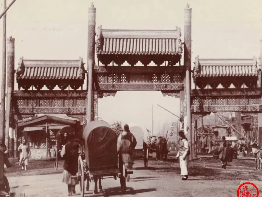 这条宽宽的大道是永定门内大街,位于中轴线上,地道北京的南北动脉,两边铺面密密麻麻,远处能模糊望到景山的影子,照片里能看到赶马车的人一路往北,街面潮湿有水印,偶有孩子骑驴凑热闹,也有老汉拄杖长吁短叹。