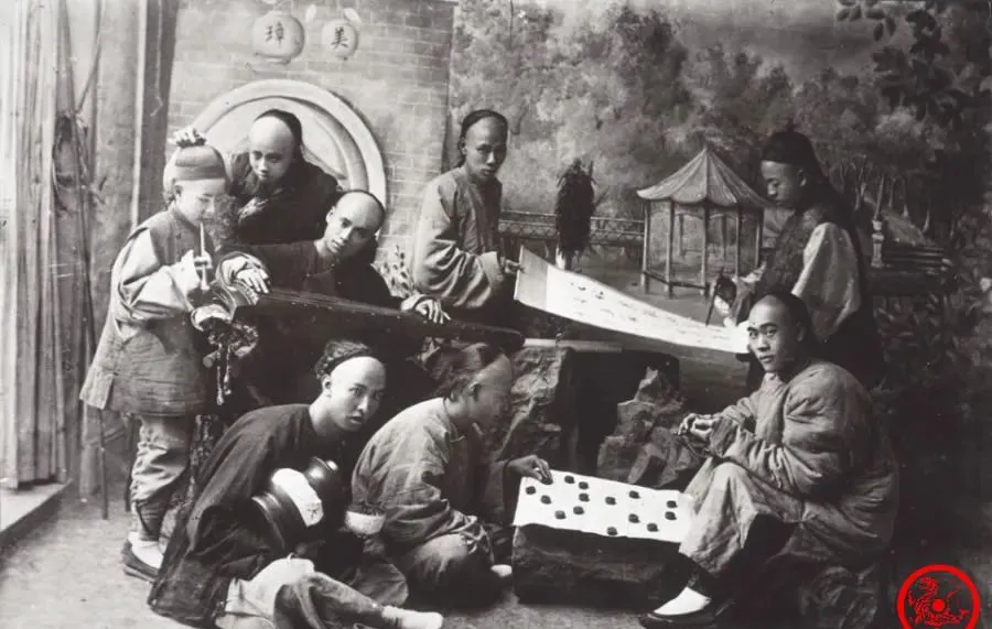 这张照片里的几个人,桌上一堆棋盘,地上有人弹琴、有人蘸墨写字,另有一位埋头画画。墙上一个大匾写着“美璋”,老照片拍得格外讲究。奶奶说,那时候真正有闲的,多半是读书人,闲时盘棋子,抚琴一曲,写下几行字,不赶集也能自得其乐。