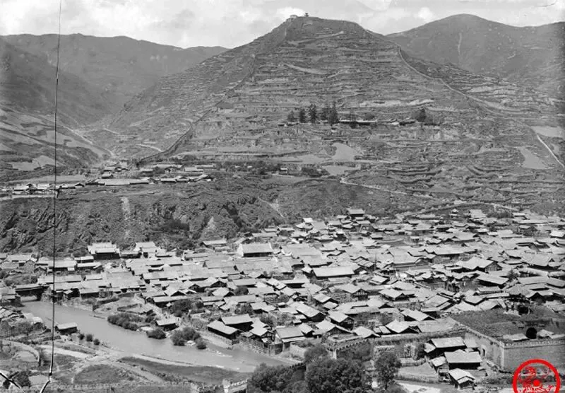 这个角度下把整个松潘镇一股脑搁进来,山坡像被怪手扒拉过,一圈圈梯田,密密麻麻的屋脊顺着河岸叠成小海浪,那时候城镇没什么高楼,青瓦房一间叠一间,屋外蜿蜒着一条水路,偶尔有烟气从屋檐悠悠冒起来,我小时候见过类似场景,兴奋得只敢远远看着,怕惊扰了屋里出来做饭的人家,这种地形天一黑人影就模糊成影子,一切都归于静了。