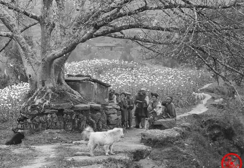 树下人影斜歪着,有的靠着根系,有的蹲在地头聊天,这棵榕树据说高得离谱,足有好几丈,粗得两个人还搂不过来,地面是一片开得正盛的罂粟花,那会儿田地里种这种东西,说是利大于粮食,村里人都愿意试,祖辈们念叨:那时改种罂粟能多收钱,地里能看到一片红白紫搅一块儿,没人喊你去拍照,可花和人都扎在了这里,现在看着有点心酸又无奈。