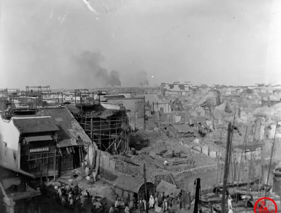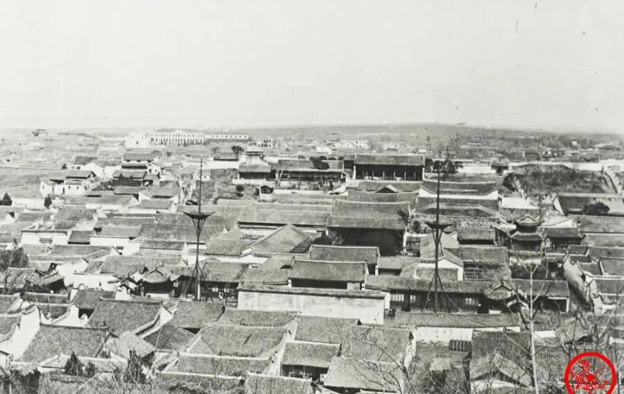 说的是汉口热闹,可照片上看,屋顶密密麻麻,瓦片一排连着一排,烟囱和旗杆夹杂在里头,布局杂乱中带点顺溜,远处还能瞧见租界那种洋楼模样,光线打下来,黑白的,对比那个年月的气派,新旧光景全搁在画面上了。