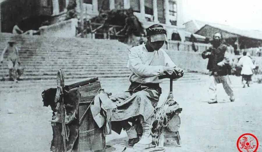 图中这人,衣裳旧旧的,双手麻利地缝补着鞋底,工具堆在脚边,他脑门上顶着一沓纸遮阳,辫子一绕就成了伪帽檐了,这讲究省工省钱,比现在的遮阳帽还能服帖,打从太阳升到晌午头,就这样溜达。