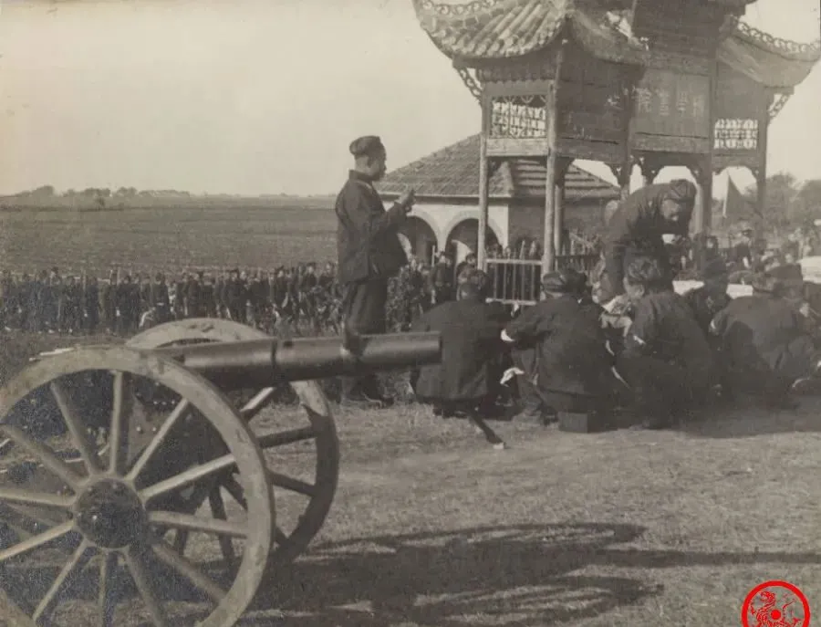 这个画面上的场面就有点意思,书院园子前头,一个大炮横在那里不稀奇,围坐一圈兵丁插着筷子吃饭,穿的衣服一水的深色军装,脑袋后面全是辫子,个别人干脆蹲着充当桌子。
