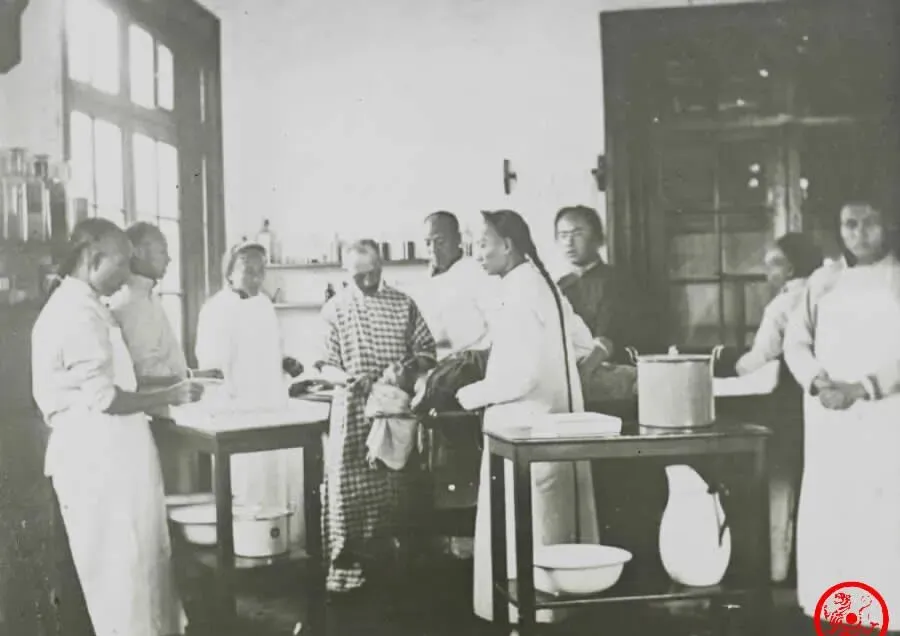 这张室内拍的,不大会看明白谁是大夫谁是助手,反正全是留着大辫子的,站在桌子两边,桌上摆着器械,最亮眼就是那一口大搪瓷盆,药水瓶搁架子上一排。