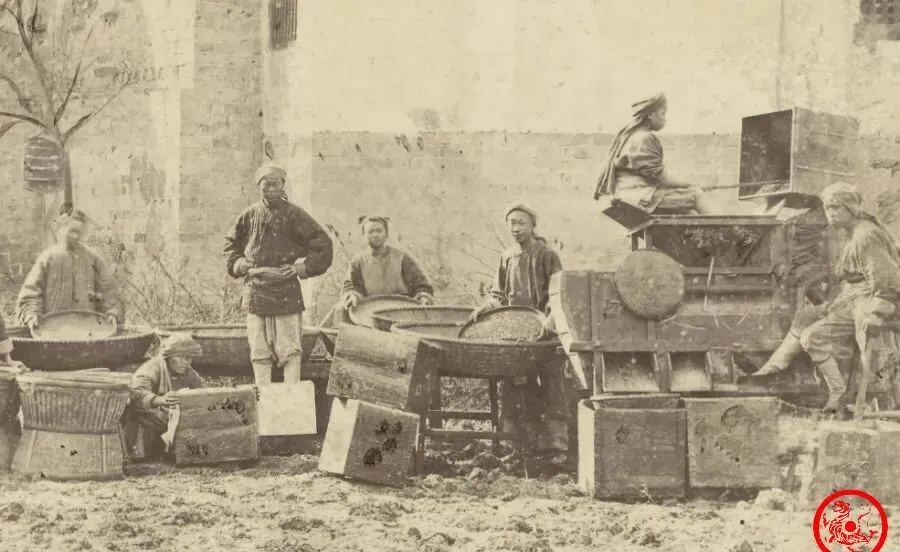 这个场口就热闹咯,图里一堆汉子围着圆木大筛和笨重箱子分拣茶叶,泥地上的茶叶渣子,袖子拉得半卷,拉扯成一条条褪色杠,连带着旁边坐着的伙计都是一身土汗,小时候听奶奶讲,羊楼洞出来的砖茶,是附近挑担子进城最抢手的货色,家里要是有谁在茶庄拣过叶,回家都能带着一股青麻味,手指头指甲缝里都是茶沫子,做工仔细的,把叶子一片片翻出来,那可比现在的机器多出百倍气魄。