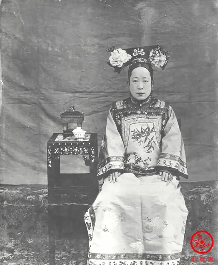 图中这位穿宫服的格格,一身绫罗绸缎坐得板正,桌上搁着一盏陶碗一只首饰盒,那小细腿桌子花活不少,衣服上全是绣花,精细得让人挑不出错,头上的两朵花压得像树杈一样,小时候姥姥会用毛线给我扎出类似的东西,摆着倒没这么壮观。