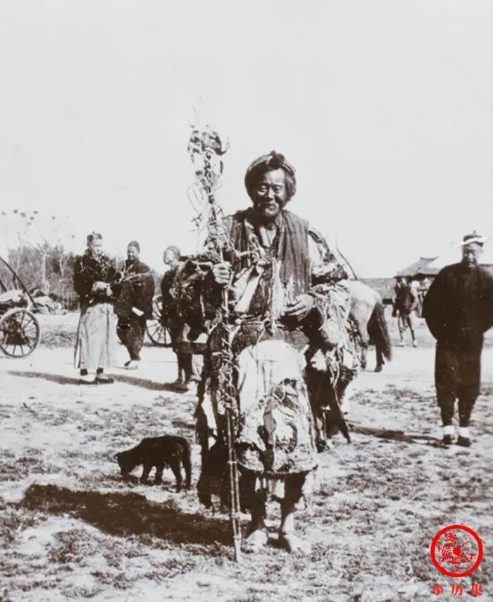 “丐帮帮主”三个字搁小说里神乎其神,真到了照片上,就是个衣衫褴褛却站得笔直的汉子,手里拎一根大棍子,身上插满破布头,身边的小狗一溜烟摇着尾巴转圈,有点江湖人的意思,拍摄这张照片的老外直接标了King of the beggars,这帮主确实有点派头。