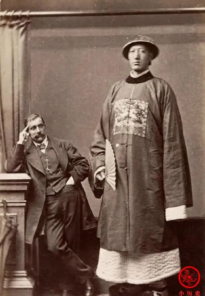 图里站得笔直那位身材高大,估摸着两米有余,穿着官服的大个子,旁边的洋人只能仰着脖子聊,巨人身上的补服、官帽,全套下来像是给身份贴标签的,姐姐以前说,这类高个子多是演艺团队招揽,穿官服其实是赶场子的噱头,但照片里气场的确比谁都足。