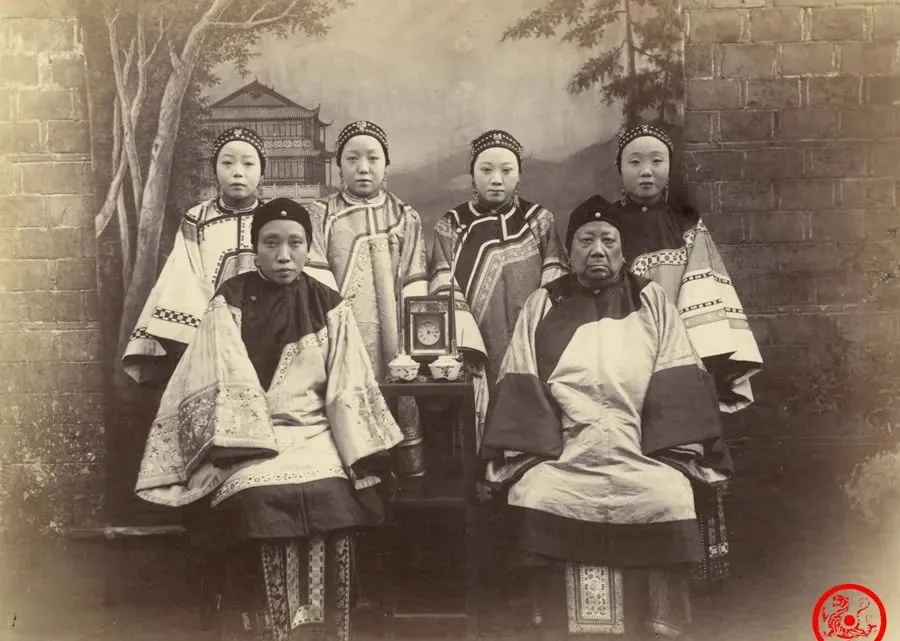 这一组女子合影,五六个人排排坐,两位年长的坐前头,后头全是讲究穿戴的姑娘,最右那位老太太面相威严,后辈们都坐得端端正正,这种家族气场,小时候逢年过节婆婆也有,屋里人谁都不敢多说话。