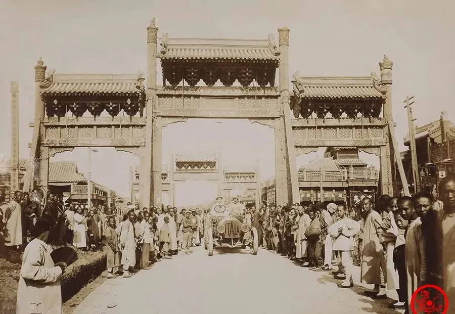 这张最带劲,老北京东四牌楼下,一辆汽车穿街过巷,四面八方的老百姓全围着瞧,脸上满是新鲜和不敢信,那年头汽车极少见,碰上“北京-巴黎”大拉力赛通过,清政府破天荒批了路条,万人空巷出来见世面。