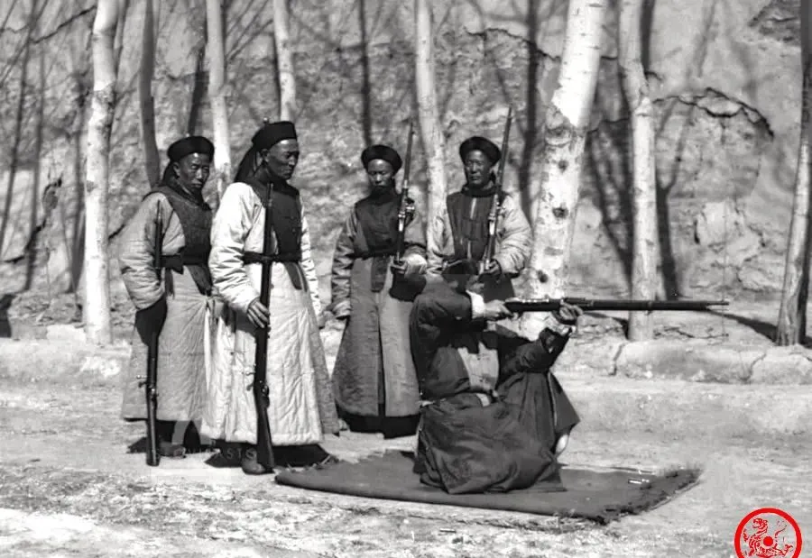 图中这帮人穿着月白袍子,头上顶着乌纱帽,手里拿的家伙不是冷兵器,是跟着潮流买来的洋枪,那时候叫步枪,长得比人还高,黑洞洞的枪管,搁在膝头,动作学得有板有眼。