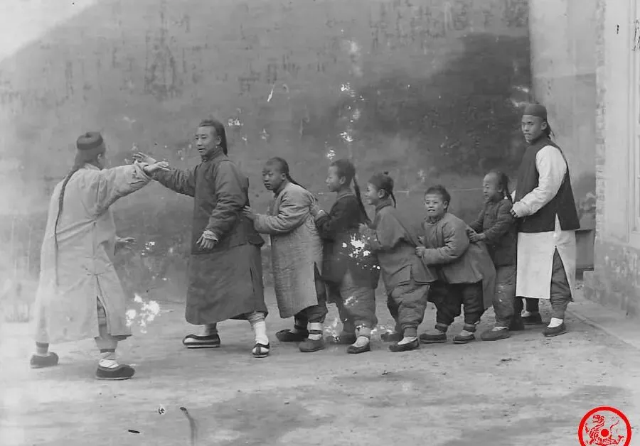 清朝老照片:秀才赶考争逐举人,少年玩“老鹰捉小鸡”游戏