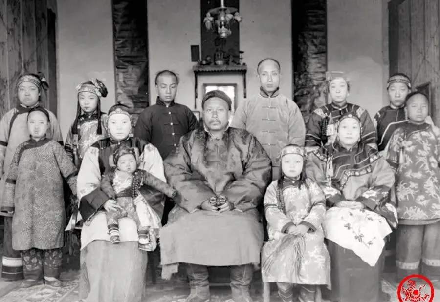 这张合影坐着站着挤满屋,穿衣打扮一眼能分出主次,男主身边坐两位夫人,一主一妾,孩子们小脸蛋一排排,一家子人坐齐了像过年。