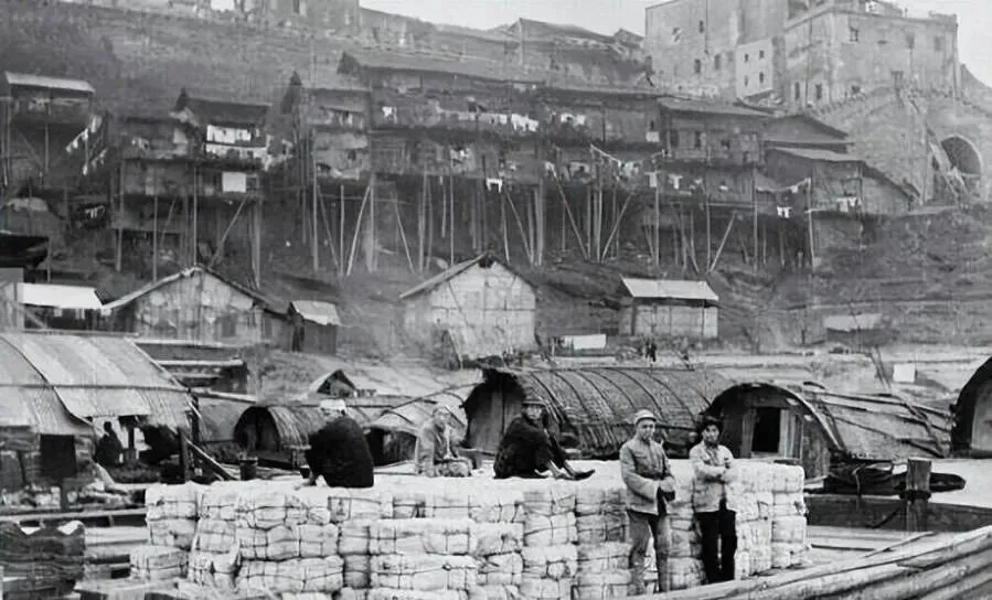 这个地方叫河街码头,以前货都靠这儿运,图里能看到一船一船的棉包,还有老式的蓬船,搬运工人有的蹲在货堆上,有的站着聊天,一边抽烟一边看江面水流,棚户区依山而建,码头风一吹全是水带的咸味和船桨搅水声,现在说水运,基本没人想起只能啃冷饭和晒棉袄的苦日子了。