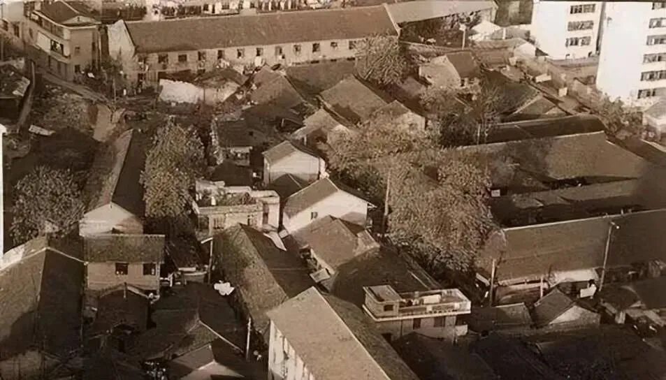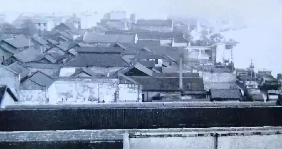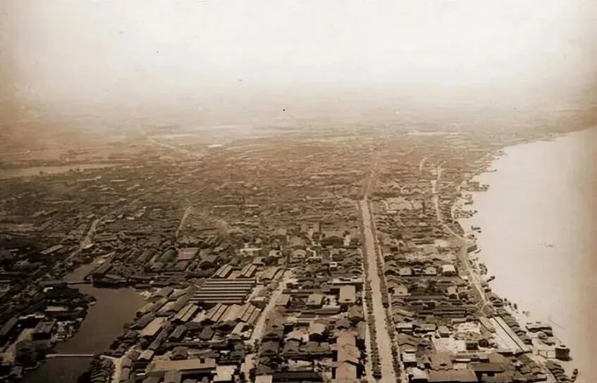 这张是高空俯瞰的常德城,江水悠悠,航道直直穿城而过,成堆的瓦房挤作一团,偶尔夹着几排老榆树,这一片密密麻麻,现在细看有几分旧上海那种味道,河岸上栈道和小码头点缀,谁还记得那时城里最多的不是车,是各种带棚子的船和板车。