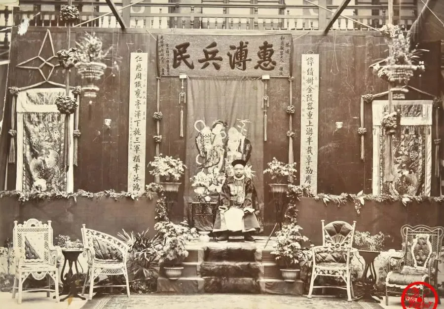 这场面摆得大,满墙对联,挂着“惠溥兵民”大匾,又是花又是椅,大红大紫堆成一角,中间坐着的那位,衣冠整齐,是“和甫观察”,大清官场的气象可见一斑,补服缎面端正,神气外露,四周摆的这些藤椅、屏风,某种程度上就算当年的“高配”,其实细瞧就能琢磨出来,那时候八旗官兵攒出这点牌面不容易,官儿不大,事儿不少,光靠朝廷的就得饿瘦,有功的除了花匾还得让上下都服气。