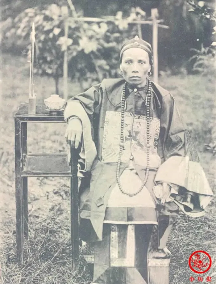 图里坐着的,就是清朝命妇,穿着一身讲究的衣裳,胸前的补子一眼瞅见,刺着孔雀,家里有三品官的夫人才有这待遇,桌上点着蜡烛摆着茶碗,全是规矩里的排场。她身上传下来的衣料,绣花压满了光,也只有那个年代的女人,才配得上这么厚重的章程,头上珠花、脖间长串佛珠挂着,表情板得紧,一点笑容都没有,真坐在那怕是也松不得劲。