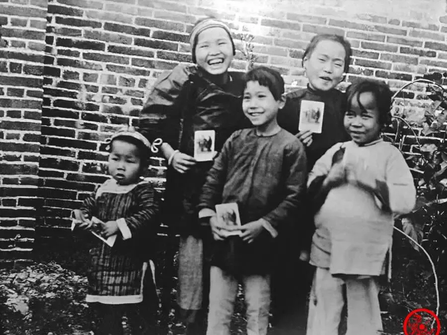 这一张气氛就不一样了,五个孩子和大姐大妈,手里举着旧照片,几个嘴巴咧开,乐得露出了门牙,只有左边那个最小的还没缓过神,小朋友拿到自己像片的那一刻,比抢糖还带劲。你要那时候家里能照一次相,都能说好几个月,拍出来一人一份,带回家都得找地方藏起来,堂屋的柜子角落里往往还贴着全家的合照,阳光下每个人都很真。