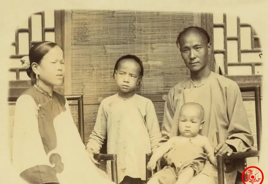 这张是普通百姓的一家人,父母抱着孩子,两个娃站坐在中间,穿的衣服朴实没什么花头,老照片拍下来的时候,可能正是夏末秋头,窗外的竹帘子挡着光,屋里头还带着余温,爸爸脸上笑得含蓄,妈妈有点紧张,那个 baby 胖乎乎的,还是襁褓里的年纪,家里人忙活一年,孩子就这么一个个被照片留了下来,以前合影是件严肃事,衣裳要整齐,孩子不能乱动,大人也很少笑得开怀,和现在拉着孩子各种凹造型不一样。