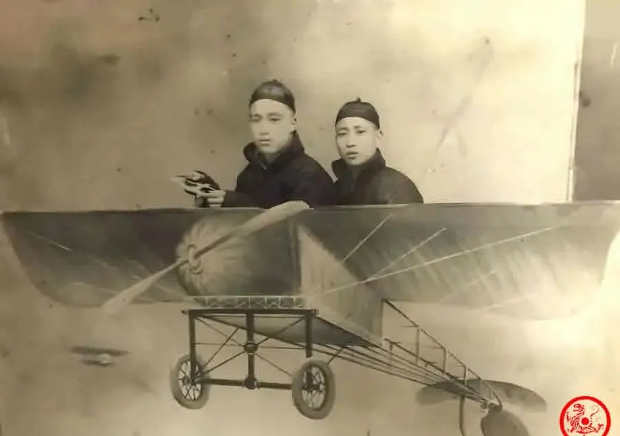 有点意思,这两位咱现在看起来像是坐进了个纸糊的飞机里,实则是照相馆给整的新花样,冯如发明飞机的事一传出来,老百姓赶时髦,也想着体会一把飞天的滋味,照相馆老板抓住机会搭了飞机制景,顾客摆好姿势往上一坐,照片出来亲戚邻居都要看两眼,家里老一辈见了,忍不住摇头笑,说这不是瞎胡闹嘛,可年轻人觉得新鲜,照片贴在堂屋墙上,说不定谁还真琢磨怎么能飞起来。