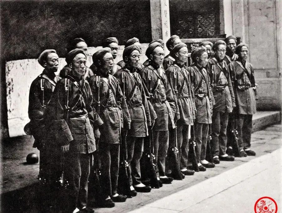 这一大队穿制服站队的,叫“卫安勇”,都是地方武装,负责守城守家,排队的士兵年纪参差不齐,有点还能站直,有的已经年过半百了,手里头拎着的洋枪洋炮,据说那会儿全靠县衙发饷养着,打仗真能顶事的不多,和现在的部队一比,气势就差远了,可那时候还真得靠这帮人看家护院。