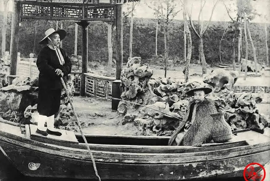 这个站在船头支着长杆子的,就是袁世凯,一身渔夫打扮,连斗笠都戴上了,旁边坐着的三哥披着蓑衣,打着赤脚,俩人泛舟池塘,表面闲适,其实这档口正是大事未决,袁世凯在家养花钓鱼,心里却想着朝局风向,家里爷爷爱说一句,水面平静,底下水流急,照片上笑容松弛,心里头算盘打得飞快。