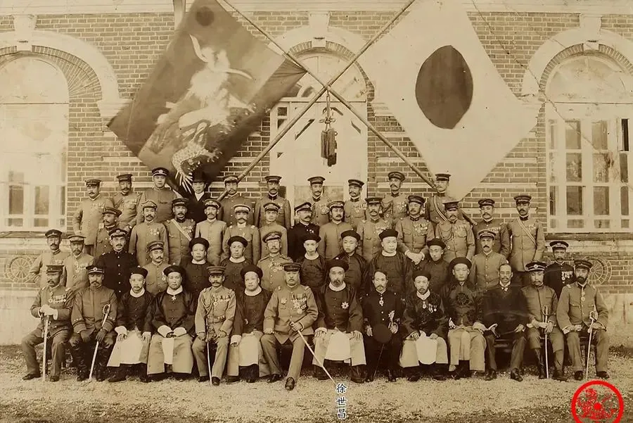 最后这个场面大,满院子的中外官兵,前排坐的清朝大臣,背后的旗子一半黄龙一半日本膏药,看着有点不是滋味,那几年日本势力咄咄逼人,东北大地风雨飘摇,清末官场也就剩口头上的体面,谁家爹又不是叨念,却无可奈何,照片拍下来传到现在,一看就明白——那年头的风雨飘摇藏在每个人的表情里。