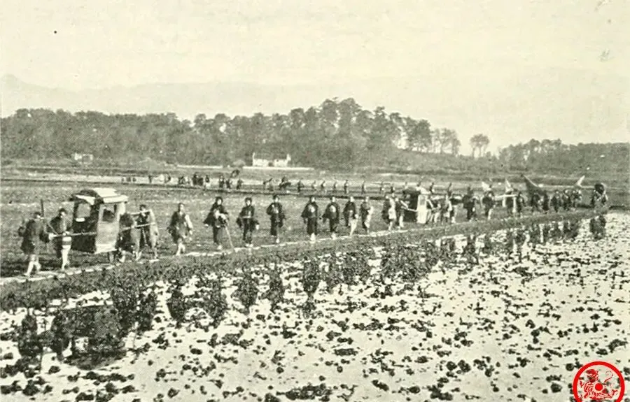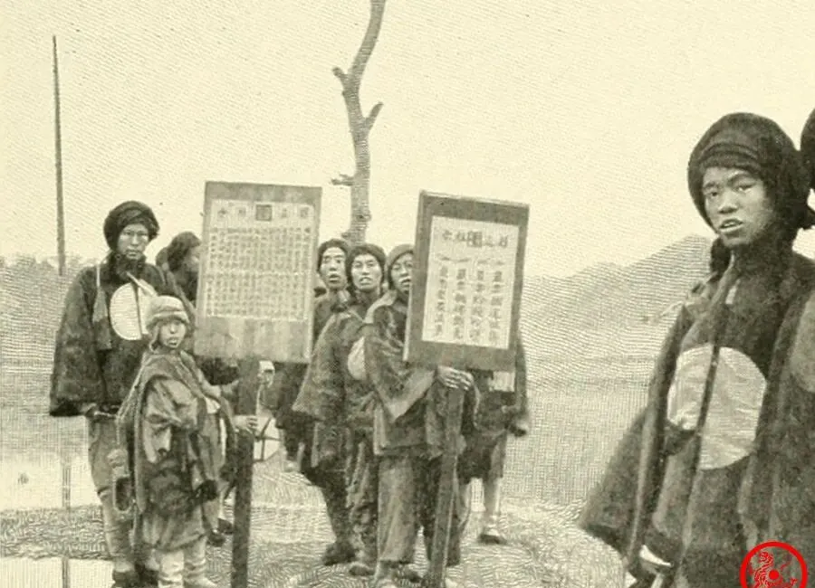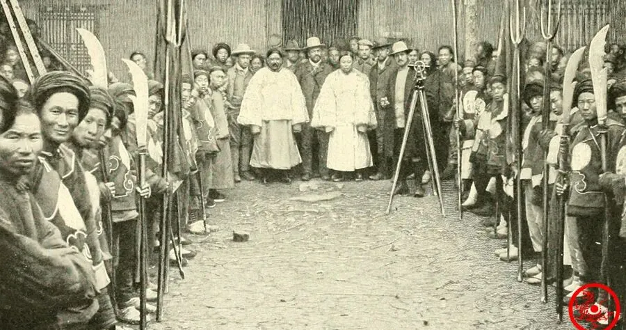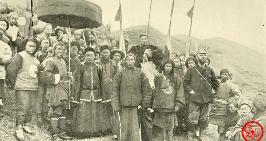 这张画面热闹,队伍里举着黑色华盖,大头官员都往前站,身旁兵丁穿圆补衣襟,旱地黄土坡人立成排,山头风一吹,长旗扑啦啦响个不停,隔着百年都能感受到那场合的威风气势,队伍里夹着几个小个子,一身短褂外头罩兴的斗篷,上面还印着吉祥大圆圈,估摸着护卫身份,一旁洋人夹在人堆里,倒也不露怯,孩子趁乱偷偷往前凑,看见华盖就觉得新鲜。