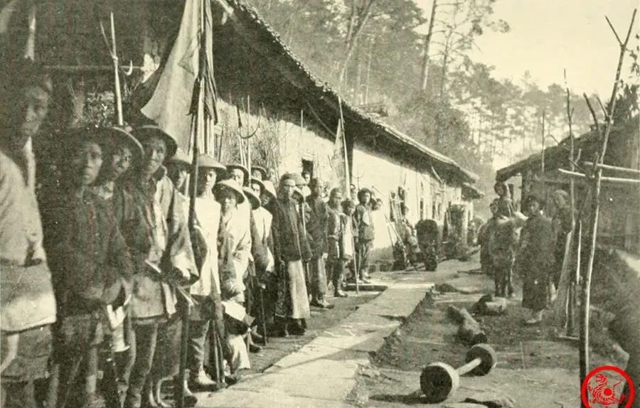 这一溜站得笔直的,是官兵守村道的模样,个个腰上系着大刀长棍,身后是茅草屋瓦墙,旗帜插在屋边风里晃,阵仗不小,村里人走过去都得侧身让一让,有个孩子抬着头张望,估计正好奇这帮叔叔什么时候能把旗换新的,爷爷小时候说,碰到这种队伍还得掂量下今天能不能随便出门,哪怕去割草都得提前打招呼,那会儿天一擦黑,家里就赶着把门闩好,怕夜里有兵马经过。