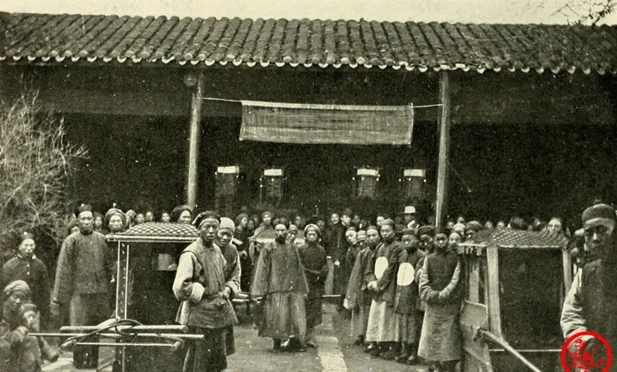 这张排场大,官衙门口,卫队左右排开,白衣官员走在正中,镜头正对大堂门口,地上泥泞踩出一道道脚印,三脚架立在厅前,估摸着那就是照相机,士兵手里寒光一闪,有戟有刀有枪,这场面要是落在现在,妥妥算大型合影现场,衙门气势硬,一群人围着一张桌子或者一帘布,老一辈的人说,官府衙门就是这样,平常百姓轻易进不去,只有出了大事或贵宾到访才会开门迎客,远远看一眼都有点发怵。
