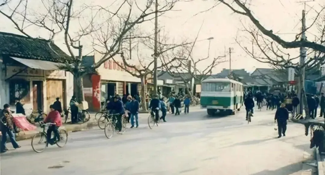 这张街景照片算是镇江老市井的缩影,街道两旁是老铺子,树枝光秃秃一片,冬天最扎眼,来来往往大队人骑着自行车,偶尔能见到一辆绿色公交车呼啦过去,孩子一边跑一边喊着追车,买菜的、送货的、扛着蛇皮袋的全是忙碌的身影,家里老人总说那时候买东西要赶早市,一不留神热门商贩就排起了长队,小贩会推着抬头柜沿街叫卖,“油条豆浆、爆米花”声音能从街头飘半条街,现在无论多繁华,这种笃悠悠的老风气却见不着了。