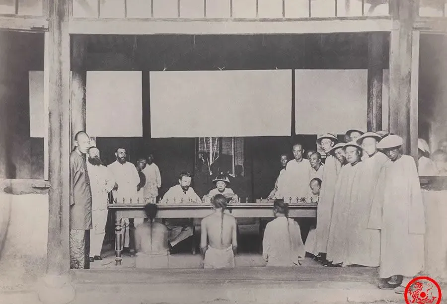 再看这张,公堂上一字排开,中间端坐的官和一旁的洋人合庭问案,这是官堂里的洋人画面,说明事情在租界发生,地方特殊,清末司法都掺了外人手,底下跪着的两个嫌犯,后背光着,也难说是啥案子,你要真以为清朝全是一片平和,那是看少了历史。