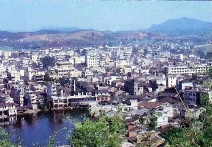 这张俯拍的城区老照片,叫人一眼认了出来,也是当年看云浮最全的一张,前景有水,后头是楼,远处的丘陵像一圈守护,小时候爸妈带着去赶集,路两边的房子密密麻麻,楼顶晒着衣服被单,谁家烧饭都能闻得见糯米香,老城区的路面窄,店铺门口总有三两辆自行车靠着,街头巷尾的声音全混一处,热闹就是家常。